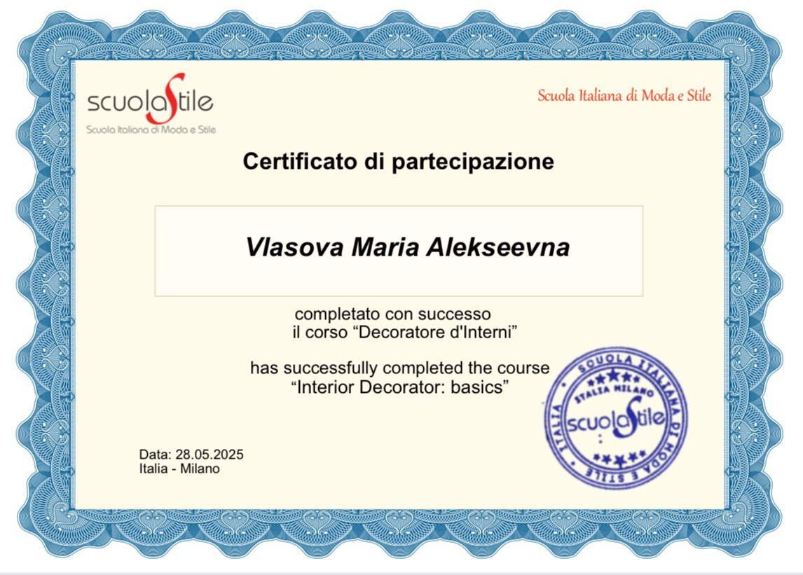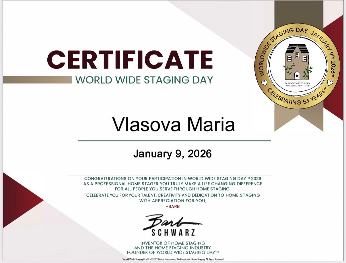 Выпускница Академии хоумстейджинга и редизайна Глории Крюнер (Германия), резидент Глобальной и Евразийской ассоциации Хоумстейджеров